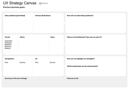 The goal of this canvas, developed by the UX Studio Team, is to refresh, refine or develop a User Experience Strategy. A really solid write up / walk through can be found HERE. You can download a large version of the canvas HERE.