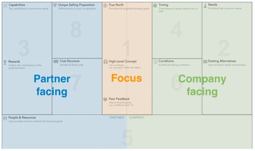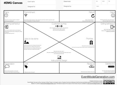 Created by Martijn Timmermans, this canvas was initially created to design events. Since then iit has been applied to design customer journeys and for many other challenges teams face. In order to access the blank template and a comprehensive guide you need to register HERE.