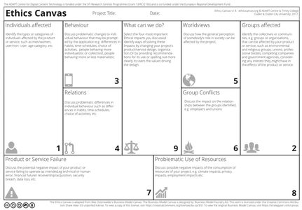 The Ethics Canvas from the Adapt Centre has been developed to encourage educators, entrepreneurs, engineers and designers to engage with ethics in their research and innovation projects.For more information on the canvas and access to an online editable version, visit HERE. A large PDF can be downloaded HERE.