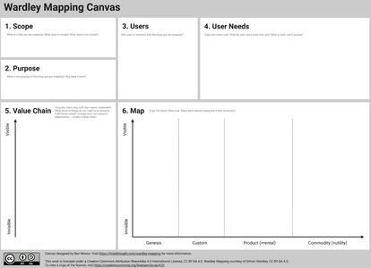 Developed by Simon Wardley, with visual support from Benjamin Mosior, this canvas maps out value chains. For a really solid overview visit HERE. Visit HERE over on Medium for the 18 chapters on Wardley’s thoughts on mapping. I really enjoyed Benjamin’s post on the mapping experience. Map Camp is a community of visual mappers that may be worth a peek at.