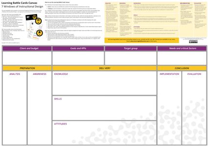 Jakub Żurawiński reached out to me via email to share this canvas with me. It’s a model for developing learning process, with a full name of “Learning Battle Cards 7 Windows of Instructional Design Canvas”. It provides users with an overview on a critical stages and characteristics of a training process and is used by trainers and instructional designers for ideation and graphic presentation of their approaches and solutions. It provides a clear and flexible structure for instructional design. Visit the website HERE for more information. Download the full version HERE.