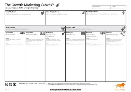 Developed by Thomas Paris & Jean-Christophe Cuvelier , The growth marketing canvas was designed to help teams to first develop a broad overview of their business and later on to provide a structure for brainstorming, which provides hand-on experiment ideas needed to kick-off growth operations in a company. For further information on the canvas and access to a .PDF version to use, please visit HERE.