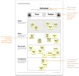 Developed by Jorge Arango, this particular canvas, focused on communication, will help you understand the language, rules, and power dynamics that make it possible for people to accomplish their purposes in particular situations—or potentially hinder them from doing so. For a really good explanation visit HERE. For a large blank canvas visit HERE. Thanks to Jack Martin Leith for bringing this to my attention over on Twitter.
